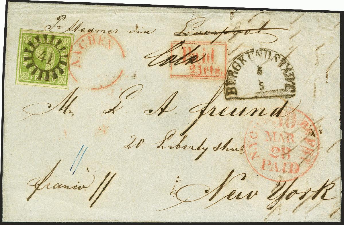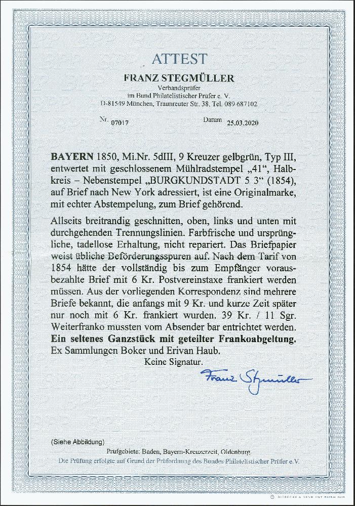 | Zusatzinformationen und Suchstichworte: | 374. Auktion Heinrich Köhler Auktionstermin 27.06.2020 Los 29 1850/58, 9 Kreuzer gelbgrün, Type III, farbfrisch und allseits breitrandig mit zentrischem geschlossenen Mühlradstempel "41" und nebengesetztem Halbkreis "BURGKUNDSTADT 5 3" (1854) auf Briefhülle mit Teil des Inhaltes nach New York. Der Brief war für den Transport über die 'British Open Mail' vorgesehen mit entsprechendem Leitvermerk "Pr. Steamer via Liverpool" und war entsprechend mit 9 Kreuzern Vereinsporto vorfrankiert. Bei Aufgabe des Briefes wurde dieser Vermerk jedoch geändert mit Leitweg "Coeln" und der Brief über die 'Prussian Closed Mail' geleitet. Für diesen Leitweg betrug das Vereinsporto seit Anfang 1854 einheitlich 6 Kreuzer, das Weiterfranko von "11" Silbergroschen bzw. "39" Kreuzern vorder- und rückseitig korrekt vermerkt. Vorderseitig roter "N. YORK BR. PKT. 30 PAID". Am Oberrand des Briefes kleine Risse, sonst sehr schöne und frische Erhaltung. Ein seltener früher Transatlantik-Brief mit geteiltem Franko. Fotoattest Stegmüller BPP (2020) (Mi.-Nr. 5d) Ausruf 1.000,00 EUR Zuschlag 4.800,00 EUR (aus der Sammlung Erivan Haub) |