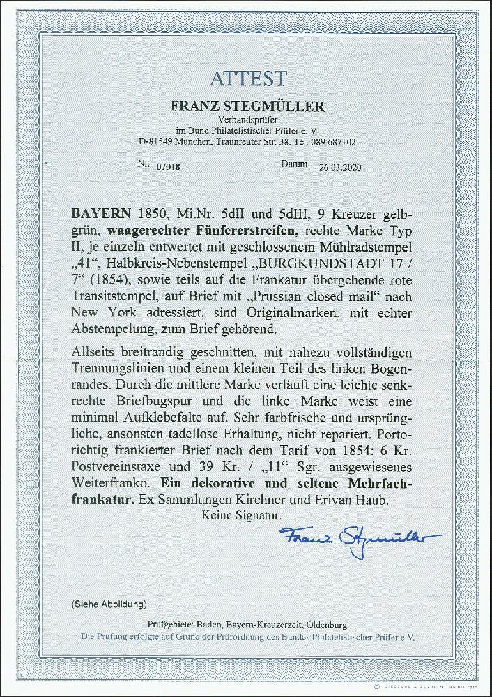 | Zusatzinformationen und Suchstichworte: | 374. Auktion Heinrich Köhler Auktionstermin 27.06.2020 Los 29 9 Kreuzer gelbgrün im waagerechten 5er-Streifen, dabei die rechte Marke in Type II, die übrigen in Type III, farbfrisch und allseits breitrandig mit nahezu vollständigen Zwischenlinien und kleinem Teil des linken Bogenrandes, mit geschlossenem Mühlradstempel "41" und nebengesetztem Halbkreis "BURGKUNDSTADT 17/7" (1854) auf komplettem Faltbrief über die 'Prussian Closed Mail' nach New York mit vorderseitigem Transitstempeln und Anlandestempel von Boston. Durch die mittlere Marke des Streifens verläuft eine leichte senkrechte Bugspur, die linke Marke mit minimaler Aufklebefalte, sonst tadellose und sehr schöne frische Erhaltung. Ein attraktiver Brief mit seltener Streifenfrankatur. Fotoattest Stegmüller BPP (2020) (Mi.-Nr. 5d) Ausruf 3.000,00 EUR Zuschlag 8.000,00 EUR (aus der Sammlung Erivan Haub) |