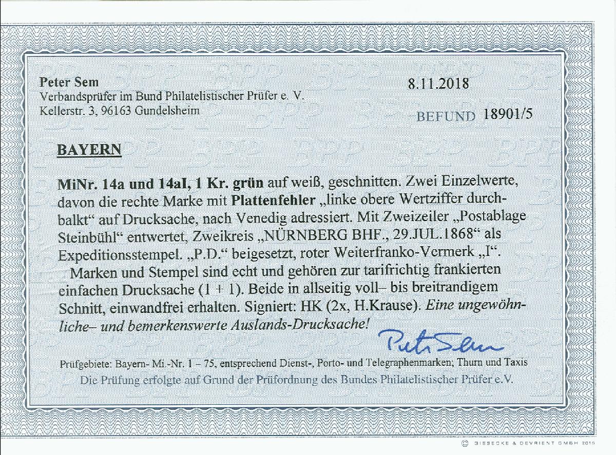 | Zusatzinformationen und Suchstichworte: | 374. Auktion Heinrich Köhler Auktionstermin 27.06.2020 Los 39 1867, Wappenausgabe 1 Kreuzer grün, 2 Einzelwerte davon einer mit Plattenfehler "linke obere Wertziffer durchbalkt", beide farbfrisch und breitrandig mit sauber aufgesetztem Langstempel "POSTABLAGE Steinbühl" auf Drucksachenhülle mit nebengesetztem Doppelkreisstempel "NÜRNBERG BHF. 19 JUL. 1868" nach Venedig mit rückseitigen Durchgangs- und Ankunftsstempeln. Eine attraktive Auslandsdrucksache und in der Kombination und mit Plattenfehler und Postablagestempel ganz außergewöhnlich. Signiert Krause, Fotoattest Brettl BPP (2002) und Fotobefund Sem BPP (2018) (Mi.-Nr. 14aI, 14a) Ausruf 400,00 EUR Zuschlag 650,00 EJUR (aus der Sammlung Erivan Haub) |