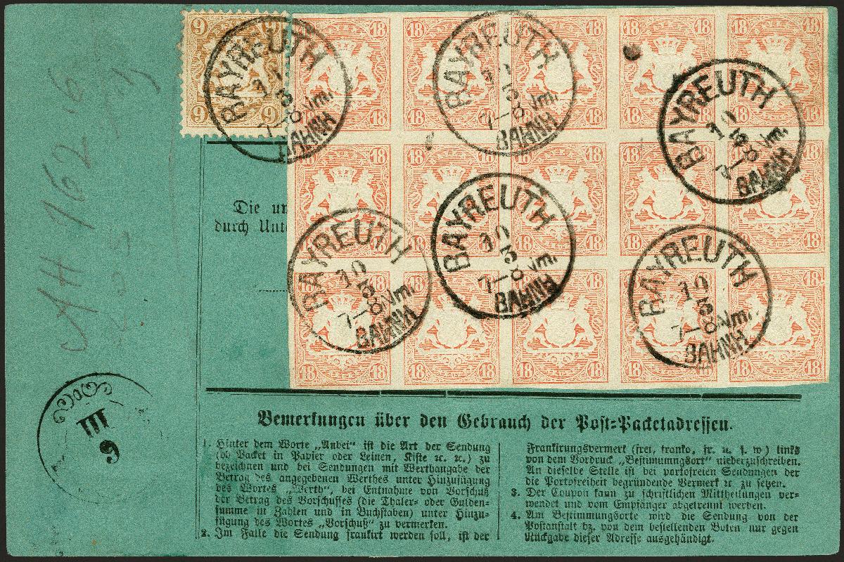 | Zusatzinformationen und Suchstichworte: | 374. Auktion Heinrich Köhler Auktionstermin 27.06.2020 Los 43 1867, Wappenausgabe geschnitten, 18 Kreuzer zinnoberrot im waagerechten 15er-Block, farbfrisch und allseits voll- bis breitrandig, zusammen mit gezähnter Ausgabe 9 Kreuzer braun mit Wasserzeichen 'weite Rauten', mit mehrfach sauber aufgesetztem Einkreisstempel "BAYREUTH 30 3" auf vollständiger Paketkarte mit Coupon nach Belgrad im Königreich Serbien mit Ankunftsstempel "BEOGRAD 6/3" (julianischer Kalender). Eine recht unauffällige senkrechte Bugspur verläuft durch die zweite senkrechte Reihe von links, ansonsten befindet sich die Frankatur in tadelloser Erhaltung (die rechte untere Marke des Blockes natürlicher Papiereinschluß). Ein absolut spektakuläres Stück mit der höchsten von uns registrierten Frankatur der Wappenausgabe und der größten bekannten Einheit der 18 Kreuzer-Marke mit Poststempelentwertung (es sind nur 2 größere Blocks mit Zeitungsstempel bzw. handschriftlicher Entwertung bekannt) und einer ungemein seltenen Destination. Ein Spitzenstück dieser Ausgabe. Fotoattest Stegmüller BPP (2020) (Mi.-Nr. 19+28Y) Ausruf 20.000,00 EUR Zuschlag 26.000,00 EUR (aus der Sammlung Erivan Haub) |