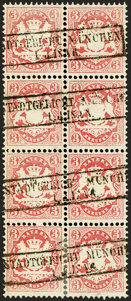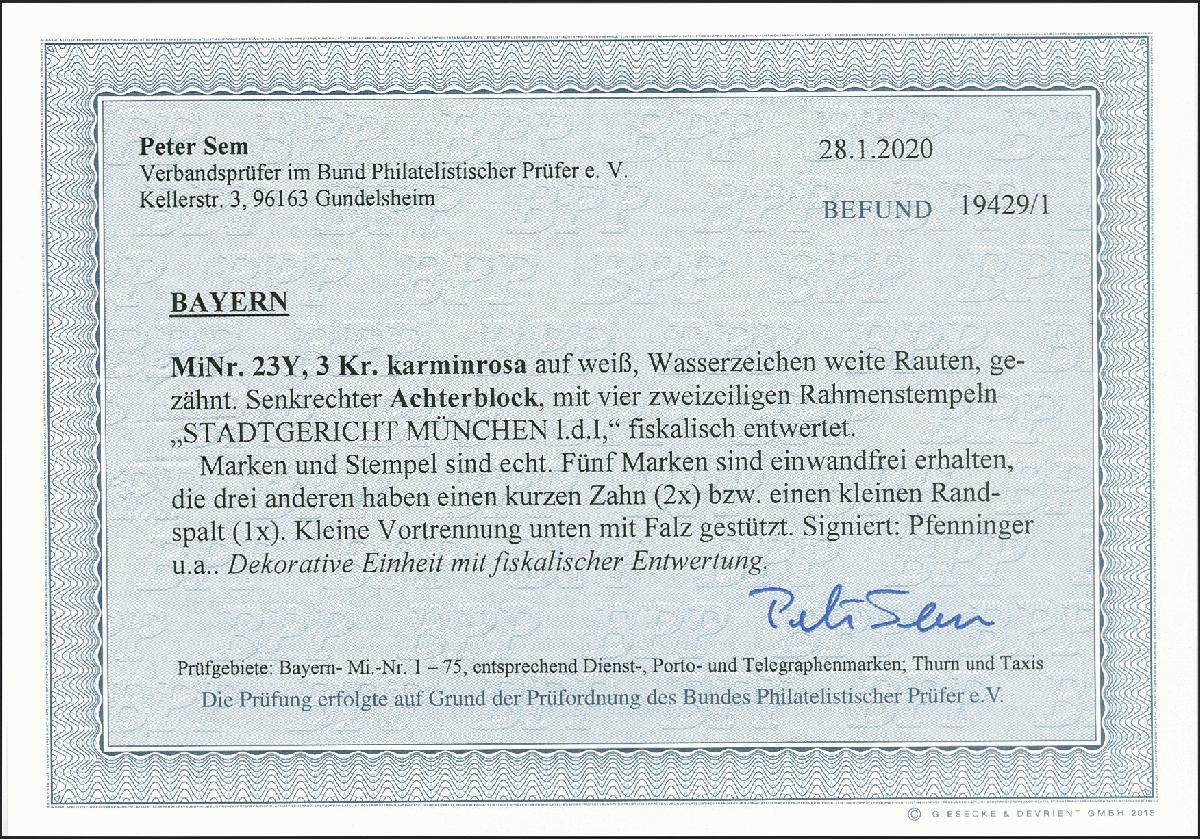 | Zusatzinformationen und Suchstichworte: | 374. Auktion Heinrich Köhler Auktionstermin 27.06.2020 Los 45 1870/75, Wappen gezähnt mit Wasserzeichen 'weite Rauten', 3 Kreuzer rosa im senkrechten 8er-Block, farbfrisch und bis auf 2 kurze Zähne und einen winzigen Randspalt einwandfrei, entwertet durch paarweise aufgesetzten Rahmenstempel "STADTGERICHT MÜNCHEN l.d. ISAR", unten leicht angetrennt und mit Falz gestützt. Eine dekorative und nicht häufige Einheit. Signiert Pfenninger und Fotobefund Sem BPP (2020) (Mi.-Nr. 23Y) Ausruf 150,00 EUR Zuschlag 200,00 EUR (aus der Sammlung Erivan Haub) |