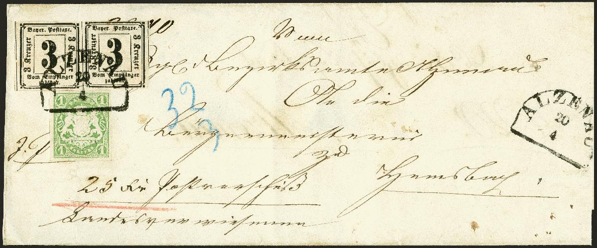 | Zusatzinformationen und Suchstichworte: | 374. Auktion Heinrich Köhler Auktionstermin 27.06.2020 Los 49 1862, Ziffer geschnitten, 3 Kreuzer schwarz im waagerechten Paar, dabei die linke Marke mit Plattenfehler "Bom", zusammen mit 1867, Wappen 1 Kreuzer grün, sehr schön farbfrisch und wie auch das Paar voll- bis breitrandig, mit sauber auf- und nebengesetztem Halbkreisstempel "ALZENAU 20/4" auf doppelt verwendeter Briefhülle mit "25 Kr. Postvorschuß" nach Hemsbach im eigenen Zustellbezirk. Mischfrankaturen zwischen Freimarken und Portomarken als Freimarken verwendet sind sehr selten, in dieser Kombination sind in der Heinrich-Köhler-Kartei nur 2 weitere (vom selben Tag und aus derselben Korrespondenz) registriert. Fotoattest Schmitt BPP (1996) (Mi.-Nr. P1+14a) Ausruf 4.000,00 EUR Zuschlag 22.000,00 EUR (aus der Sammlung Erivan Haub) |