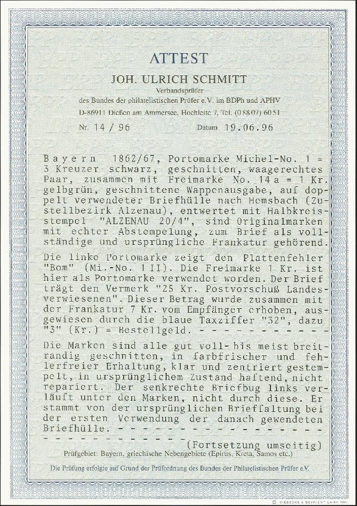 | Prüfgebiet: | Altdeutschland Bayern Portomarken |