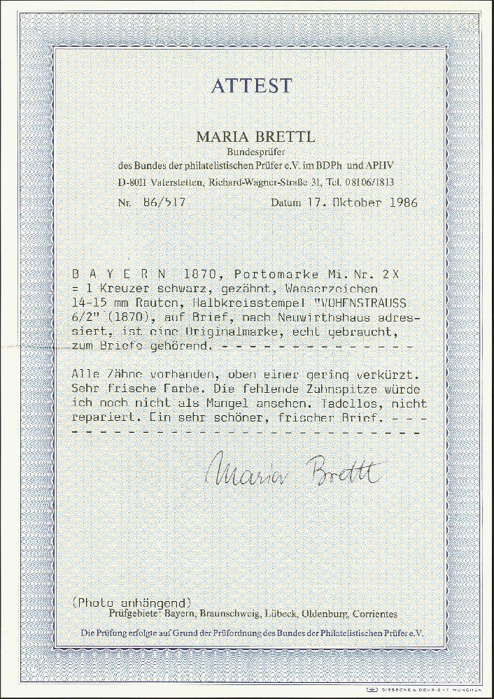| Prüfgebiet: | Altdeutschland Bayern Portomarken |