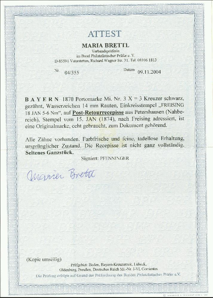 | Zusatzinformationen und Suchstichworte: | 374. Auktion Heinrich Köhler Auktionstermin 27.06.2020 Los 51 3 Kreuzer schwarz, farbfrisch und einwandfrei gezähnt mit sauber aufgesetztem Einkreisstempel "FREISING 18 JAN." auf nicht vollständiger Retourrecepisse von "PETERSHSEN 15 JAN."; vorderseitig kleiner Falzrest, sonst einwandfrei. Signiert Pfenninger und Fotoattest Brettl BPP (Mi.-Nr. 3X) Ausruf 300,00 EUR Zuschlag 400,00 EUR (aus der Sammlung Erivan Haub) |