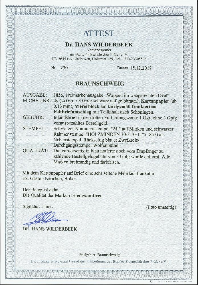 | Zusatzinformationen und Suchstichworte: | 374. Auktion Heinrich Köhler Auktionstermin 27.06.2020 Los 53 ¼ Gutegroschen auf hellgelbbraunem Kartonpapier im 4er-Block, farbfrisch und allseits breitrandig mit zentrisch aufgesetzter Nummer "24" und nebengesetztem Rahmenstempel "HOLZMINDEN 30/3" (1857) auf Briefhülle mit Teil des Inhaltes nach Schöningen mit vorderseitig in blauer Kreide notiertem Bestellgeld von "3" Gutepfennig (radiert). Die schönste der 10 in der Heinrich-Köhler-Kartei registrierten 4er-Block-Frankaturen. Signiert Thier und Fotoattest Dr. Wilderbeek BPP (2018) (Mi.-Nr. 4y) Ausruf 2.000,00 EUR Zuschlag 3.600,00 EUR (aus der Sammlung Erivan Haub) |