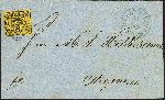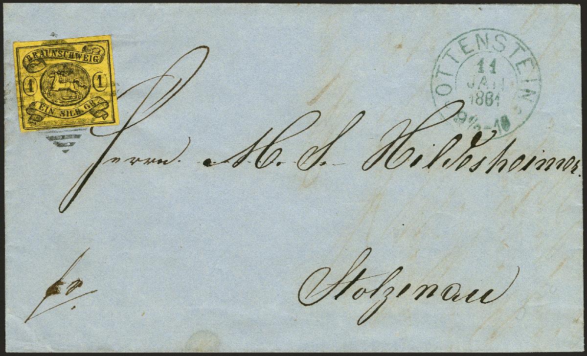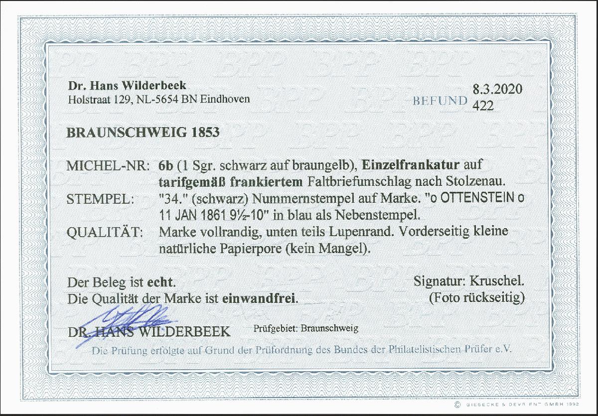| Zusatzinformationen und Suchstichworte: | 374. Auktion Heinrich Köhler Auktionstermin 27.06.2020 Los 54 1853, Wappenausgabe auf farbigem Papier 1 Silbergroschen auf braungelb, farbfrisch und voll- bis breitrandig mit zentrisch aufgesetzter Nummer "34" und sauber nebengesetztem blauen Doppelkreisstempel "OTTENSTEIN 11 JAN 1861" auf komplettem Faltbrief nach Stolzenau. Ein schöner Brief des seltenen Postortes. Signiert Kruschel und Fotobefund Dr. Wilderbeek BPP (2020) (Mi.-Nr. 6b) Ausruf 150,00 EUR Zuschlag 500,00 EUR (aus der Sammlung Erivan Haub) |
