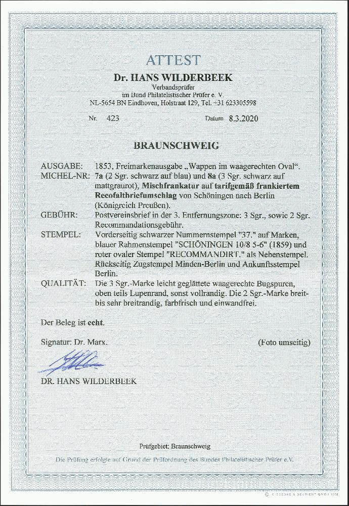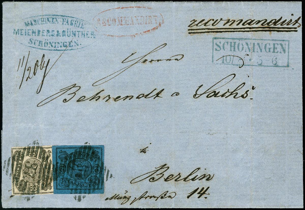 | Zusatzinformationen und Suchstichworte: | 374. Auktion Heinrich Köhler Auktionstermin 27.06.2020 Los 55 2 Silbergroschen auf blau und 3 Silbergroschen auf mattgraurot, letztere oben rechts lupenrandig, sonst beide voll- bis breitrandig und farbfrisch, mit Nummer "37" und nebengesetztem blauen Rahmenstempel "SCHÖNINGEN 10/8" auf rekommandierter Briefhülle mit rotem Ovalstempel "RECOMMANDIRT" nach Berlin. Die 3 Silbergroschen leichte geglättete Bugspuren, sonst einwandfrei. Ein attraktiver Chargé-Brief. Fotoattest Dr. Wilderbeek BPP (2020) (Mi.-Nr. 7a, 8a) Ausruf 300,00 EUR Zuschlag 380,00 EUR (aus der Sammlung Erivan Haub) |