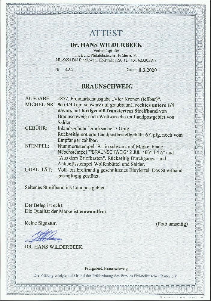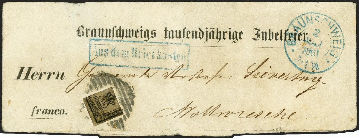 | Zusatzinformationen und Suchstichworte: | 374. Auktion Heinrich Köhler Auktionstermin 27.06.2020 Los 57 1857, Teilbare Inlandsmarke ¼ Gutegroschen auf graubraun mit Nummer "9" und nebengesetztem blauen Doppelkreisstempel "BRAUNSCHWEIG 2 JULI 1861" sowie ebenfalls blauem Rahmenstempel "Aus dem Briefkasten" auf komplettem Streifband mit Vordruck "Braunschweigs tausendjährige Jubelfeier" nach Woltwiesche im Landpostgebiet von Salder mit Durchgangs- und Ankunftsstempeln von Wolfenbüttel und Salder. Die Landpostbestellgebühr von "6" Gutepfennig rückseitig in Rötel notiert. Das Streifband geringfügig gestützt, sonst einwandfrei. Ein attraktives und interessantes Stück. Fotoattest Dr. Wilderbeek BPP (2020) (Mi.-Nr. 9a) Ausruf 300,00 EUR Zuschlag 1.200,00 EUR (aus der Sammlung Erivan Haub) |