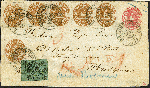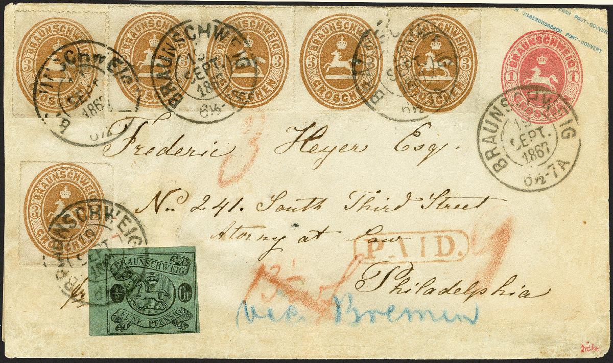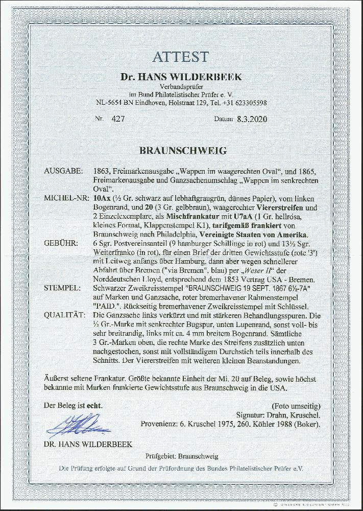 | Zusatzinformationen und Suchstichworte: | 374. Auktion Heinrich Köhler Auktionstermin 27.06.2020 Los 63 1865, Wappen im Oval, 3 Groschen gelbbraun, waagerechter 4er-Streifen und 2 Einzelwerte in Mischfrankatur mit 1863, ½ Groschen schwarz auf grün, unten lupen- sonst voll- bis breitrandig mit schmalem linken Bogenrand, mit Doppelkreisstempel "BRAUNSCHWEIG 19 SEPT. 1867" als Zufrankatur auf Ganzsachenumschlag 1 Groschen rosa als Brief der 3. Gewichtsstufe über Bremen mit rückseitigem Schlüsselstempel von Bremerhaven nach Philadelphia. Der Brief ist für den Leitweg über die Hansestädte korrekt frankiert mit 6 Silbergroschen Postvereinsporto und 13½ Silbergroschen Weiterfranko, er ist links minimal verkürzt und gereinigt. Der 4er-Streifen kleine Beanstandungen, oben und rechts unten nachgestochen, ebenso wie die beiden Einzelwerte oben. Einer der eindrucksvollsten Transatlantikbriefe Braunschweigs, wir haben keine höhere Auslandsfrankatur registriert, darüber hinaus größte bekannte Einheit der 3 Groschen auf Brief. Signiert Drahn und Kruschel sowie Fotoattest Dr. Wilderbeek BPP (2020) (Mi.-Nr. 20+10Ax, U7aA) Ausruf 5.000,00 EUR Zuschlag 26.000,00 EUR (aus der Sammlung Erivan Haub) |