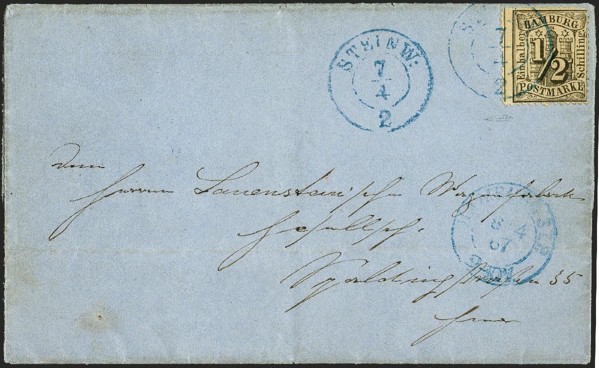 | Zusatzinformationen und Suchstichworte: | 374. Auktion Heinrich Köhler Auktionstermin 27.06.2020 Los 69 1864, Gezähnte Ausgabe ½ Schilling schwarz mit sauber auf- und nebengesetztem blauen Doppelkreisstempel "STEINW: 2 7/4" auf Briefhülle mit nebengesetztem blauen Doppelkreisstempel "HAMBURG ST.P. 8/4 64" nach Hamburg. Die Zähnung der Marke im Oberrand durch Randklebung etwas bestoßen, sonst gute und attraktive Erhaltung. Der Landpoststempel von Steinwerder ist außerordentlich selten; als Entwerter haben wir ihn nur ein weiteres Mal registriert und zwar auf einem Briefstück aus den Sammlungen Traber und Boker. Ein einmaliger Brief der Hamburger Landpost. Signiert Kruschel und W. Engel mit Attest, Fotoattest Lange BPP (2004) (Mi.-Nr. 10) Ausruf 3.000,00 EUR Zuschlag 4.000,00 EUR (aus der Sammlung Erivan Haub) |
