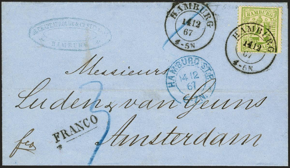 | Zusatzinformationen und Suchstichworte: | 374. Auktion Heinrich Köhler Auktionstermin 27.06.2020 Los 70 4 Schilling gelbgrün mit sauber auf- und nebengesetztem preußischen Doppelkreisstempel "HAMBURG 14 12 67" auf Briefkuvert nach Amsterdam mit rückseitigem Ankunftsstempel. Da die Niederlande im Zuständigkeitsbereich des Stadtpostamtes lagen, wurde der Brief ordnungsgemäß an dieses übergeben, hier wurde der nebengesetzte Stempel gestrichen, mit dem blauen "HAMBURG ST.P. 14 12 67" ersetzt und der Brief weiterbefördert. Ein attraktiver und in dieser Form sehr seltener Brief; wir haben keinen weiteren mit einer Fremdentwertung einer Hamburger Marke durch den preußischen Doppelkreisstempel registriert. Signiert Hunziker mit Fotoattest (1965) (Mi.-Nr. 16a) Ausruf 500,00 EUR Zuschlag 1.800,00 EUR (aus der Sammlung Erivan Haub) |