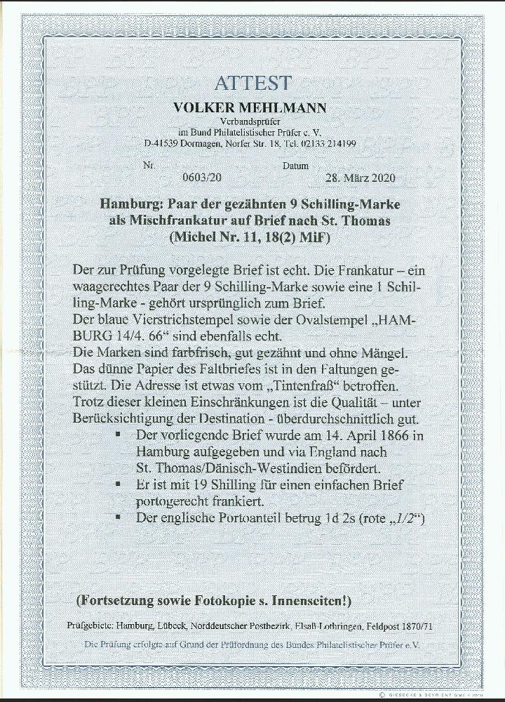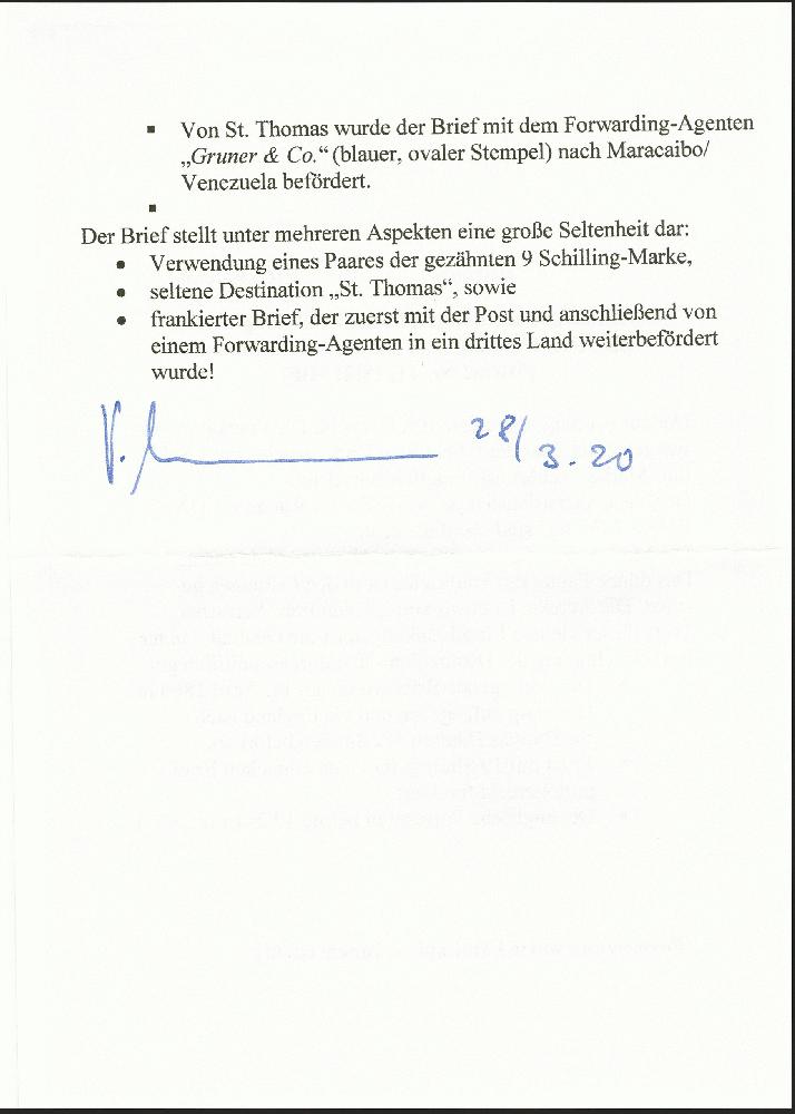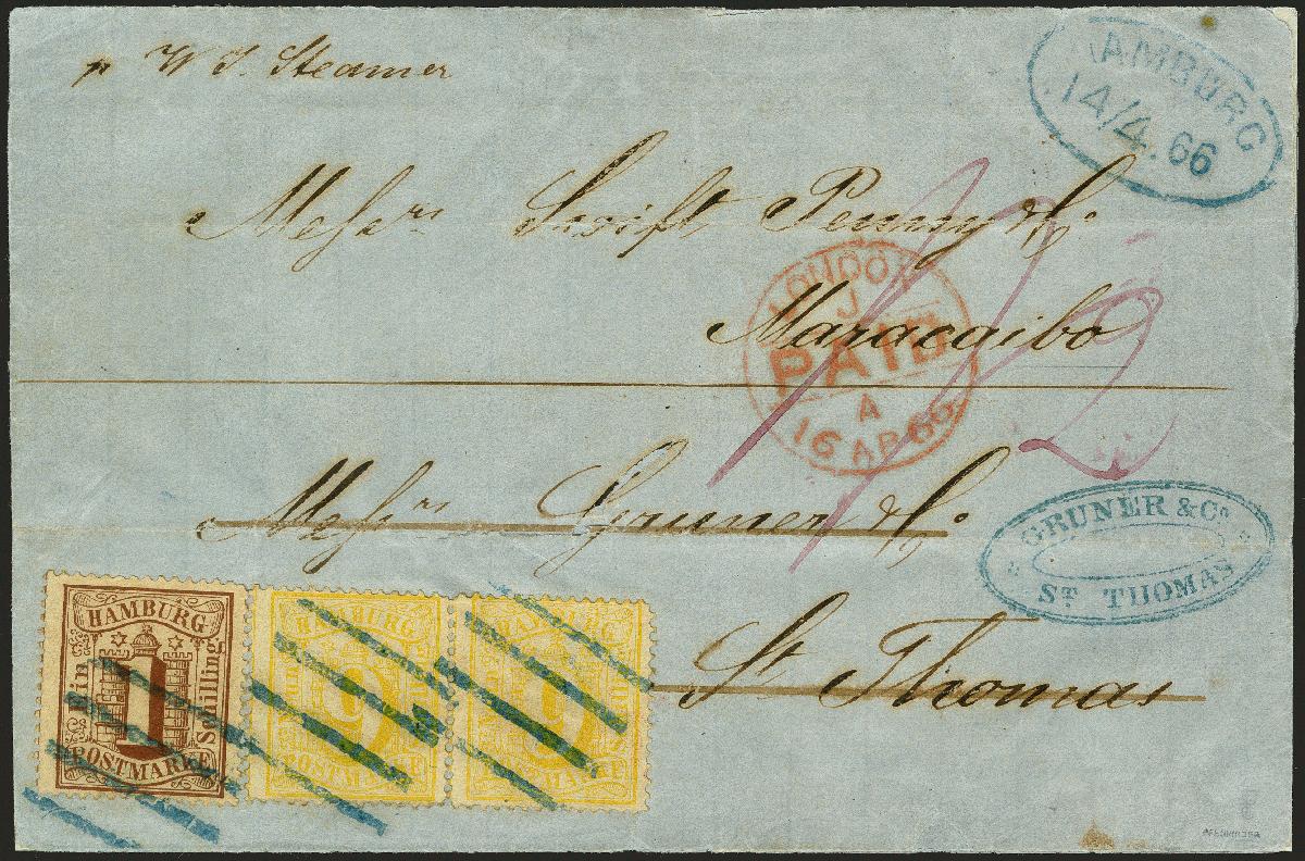 | Zusatzinformationen und Suchstichworte: | 374. Auktion Heinrich Köhler Auktionstermin 27.06.2020 Los 75 1864, 9 Schilling orangegelb im waagerechten Paar und 1 Schilling braun, alle farbfrisch und gut gezähnt mit jeweils sauber aufgesetztem blauen Balkenstempel und nebengesetztem Ovalstempel "HAMBURG 14/4.66" auf Briefhülle über den Forwarding Agent Gruner & Co. in St. Thomas mit entsprechendem rückseitigen Transitstempel nach Maracaibo, Venezuela. Die Frankatur in ungewöhnlich frischer Erhaltung, die Briefhülle mit leichtem Tintenfraß in der Adresse und in den Faltungen teils gebrochen, sonst in sehr guter Erhaltung für diesen Leitweg und Destination. Ein attraktiver und seltener Transatlantik-Brief aus der bekannten Swift Penny & Co.-Korrespondenz. Signiert Pfenninger, Ernst Stock und Thier, Gemeinschaftsattest Brettl/Schmitt (1983), Fotoattest Mehlmann BPP (2020) (Mi.-Nr. 18, 11) Ausruf 10.000,00 EUR Zuschlag 14.000,00 EUR (aus der Sammlung Erivan Haub) |