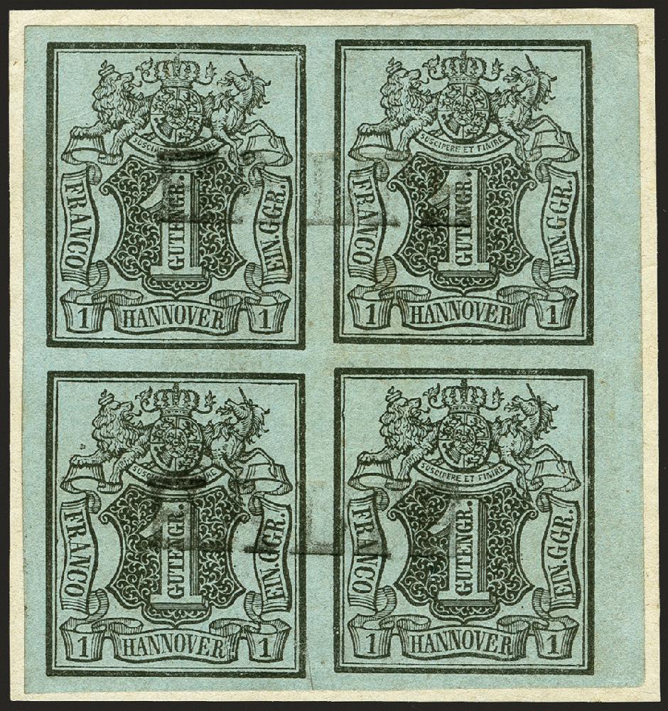 | Zusatzinformationen und Suchstichworte: | 374. Auktion Heinrich Köhler Auktionstermin 27.06.2020 Los 81 1850, Inlandsmarke 1 Gutegroschen schwarz auf blaugrau im 4er-Block, farbfrisch und allseits breitrandig geschnitten, rechts mit schmalem Bogenrand, leicht und sauber paarweise entwertet durch schwarzen Langstempel "HALTE" auf Briefstück. Schöne und einwandfreie Erhaltung ( unten kleiner Vortrennschnitt außerhalb der Markenbilder; eine rückseitig vorhandene Knitterspur ist vorderseitig kaum sichtbar). 4er-Blocks dieser Marke sind sehr selten, in der Heinrich-Köhler-Kartei sind nur 3 weitere registriert, davon kein weiterer mit Langstempel. Ein außerordentlich attraktives Stück. Signiert Grobe und Fotoattest Berger BPP (2019) (Mi.-Nr. 1) Ausruf 6.000,00 EUR Zuschlag 6.500,00 EUR (aus der Sammlung Erivan Haub) |