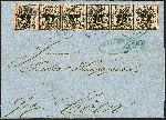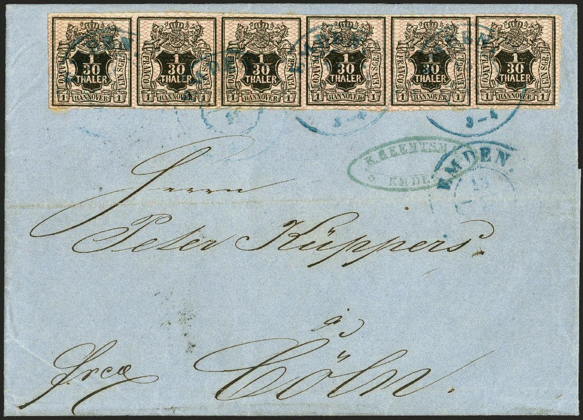 | Zusatzinformationen und Suchstichworte: | 374. Auktion Heinrich Köhler Auktionstermin 27.06.2020 Los 93 1856/57, Wappenausgabe mit Netzunterdruck 1/30 Taler schwarz/rosa im waagerechten 6er-Streifen, farbfrisch und allseits voll- bis breitrandig mit Doppelkreisstempel "EMDEN 13/11" (1858) auf kompletten Faltbrief der 2. Gewichtsstufe nach Köln mit rückseitigen Bahnpost- und Ankunftsstempeln. Schöne ursprüngliche und einwandfreie Erhaltung (der Ordnung halber erwähnen wir bei der linken Marke einen kleinen Vortrennschnitt außerhalb des Markenbildes sowie ein minimales Altersfleckchen). Nach dem berühmten 12er-Block aus der Weinberger-Sammlung ist dies die größte bekannte Einheit dieser Marke auf Brief und ein Unikat. Ein aufsehenerregendes Stück. Fotoattest Berger BPP (2019) (Mi.-Nr. 10a) Ausruf 20.000,00 EUR Zuschlag 23.000,00 EUR (aus der Sammlung Erivan Haub) |