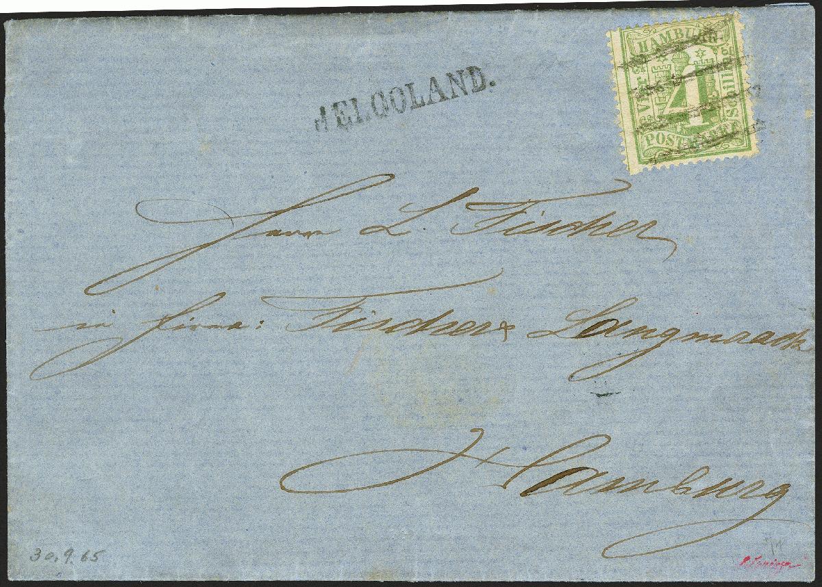 | Zusatzinformationen und Suchstichworte: | 374. Auktion Heinrich Köhler Auktionstermin 27.06.2020 Los 102 1865, Kompletter Faltbrief datiert "Helgoland 30 Aug. 65" nach Hamburg, frankiert mit Hamburger Freimarke 1864, 4 Schilling gelbgrün mit leicht und sauber aufgesetztem Strichstempel und nebengesetztem Herkunftsstempel "HELGOLAND." in schwarzer Farbe. Der Brief stammt aus der 1. Periode der Verwendung Hamburger Freimarken auf Helgoland, während der die Marken erst bei Ankunft in Hamburg entwertet wurden. Die Marke zeigt eine leichte waagerechte Druckfalte, 2 verkürzte Zähne und einige ergänzte Zähne am Oberrand, sonst gute und frische Erhaltung. In der Heinrich-Köhler-Kartei sind insgesamt nur 8 frankierte Briefe der ersten Periode registriert, davon nur ein weiterer mit der gezähnten Ausgabe. Eine der großen Seltenheiten der Helgoland-Philatelie. Signiert Lemberger und Fotoattest Mehlmann BPP (2020) (Mi.-Nr. HH16a) Ausruf 4.000,00 EUR Zuschlag 6.000,00 EUR (aus der Sammlung Erivan Haub) |