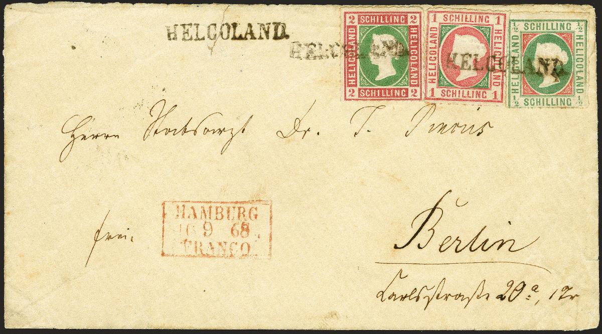 | Zusatzinformationen und Suchstichworte: | 374. Auktion Heinrich Köhler Auktionstermin 27.06.2020 Los 104 1867/68, Durchstochene Ausgabe ½ Schilling in Type II, 1 Schilling und 2 Schilling, als Streifen geklebt, alle farbfrisch, die ½ Schilling rechts mit leichten Durchstichunregelmäßgkeiten und die 1 Schilling gering eckrund, sonst alle gut durchstochen und einwandfrei, mit sauber auf- und nebengesetztem Langstempel "HELGOLAND." auf Briefkuvert nach Berlin mit vorderseitigem roten Rahmenstempel "HAMBURG / 16 9 68 / FRANCO" sowie rückseitigem Transit- und Distributionsstempeln. Das Kuvert kleine Randrisse und in den Faltungen teils getrennt sowie der größte Teil der rückseitigen Verschlußklappe ergänzt. Eine attraktive und seltene Dreifarbenfrankatur der 1. Ausgabe. In der Heinrich-Köhler-Kartei sind nur 6 weitere registriert. Fotoatteste Lemberger BPP (1985) und Heitmann BPP (2020) (Mi.-Nr. 1II, 2, 3) Ausruf 3.000,00 EUR Zuschlag 11.000,00 EUR (aus der Sammlung Erivan Haub) |