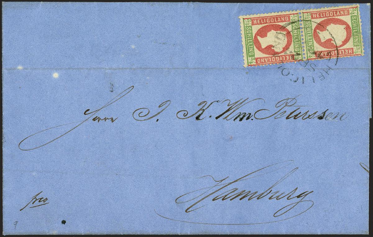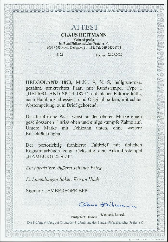 | Zusatzinformationen und Suchstichworte: | 374. Auktion Heinrich Köhler Auktionstermin 27.06.2020 Los 105 1873, 3/4 Schilling hellgrün/rosa im senkrechten Paar mit Rundstempel "HELIGOLAND SP 24 1874" auf blauer Briefhülle nach Hamburg mit Ankunftsstempel vom nächsten Tag. Die obere Marke des Paares unauffälliger Einriß am Oberrand, die untere mit Fehlzahn unten, sonst gute und frische Erhaltung. Paare sind die größten bekannten gebrauchten Einheiten dieser Marke, auf Brief sind in der Heinrich-Köhler-Kartei nur 2 weitere registriert. Signiert Lemberger BPP und Fotoattest Heitmann BPP (2020) (Mi.-Nr. 9) Ausruf 2.000,00 EUR Zuschlag 7.500,00 EUR (aus der Sammlung Erivan Haub) |