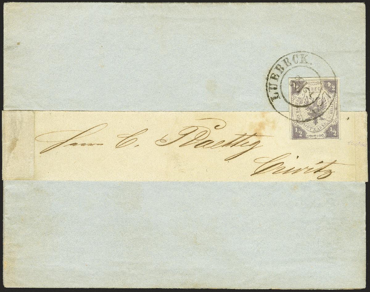 | Zusatzinformationen und Suchstichworte: | 374. Auktion Heinrich Köhler Auktionstermin 27.06.2020 Los 107 1859, Wappenausgabe auf Papier mit Wasserzeichen ½ Schilling dunkelviolettgrau in sehr schöner frischer tiefer Farbe, links unten gut voll- sonst allseits sehr breitrandig, mit glasklar übergehend aufgesetztem Doppelkreisstempel "LUEBECK 28/2" (1859) auf vollständiger Drucksachensendung unter Streifband nach Crevitz in Mecklenburg. Die Marke war zur Kontrolle gelöst und wurde zum Ausgleich zwischen Streifband und Drucksache mit Falz auf zusätzlicher kleiner Unterlage befestigt und replaziert; das beim Öffnen zerrissene Streifband wurde zusammengefügt und eine Beschriftung auf dem Drucksachenpapier praktisch unsichtbar entfernt. Einzelfrankaturen dieser Marken sind - insbesondere in derart schöner Erhaltung - außerordentlich selten, auf Drucksache in der Heinrich-Köhler-Kartei nur eine weitere registriert. Signiert Ressel, Decker, Kleeberg und Stock; Fotoattest Heitmann BPP (2020) (Mi.-Nr. 1) Ausruf 10.000,00 EUR Zuschlag 22.000,00 EUR (aus der Sammlung Erivan Haub) |
