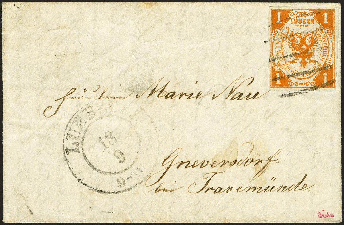 | Zusatzinformationen und Suchstichworte: | 374. Auktion Heinrich Köhler Auktionstermin 27.06.2020 Los 108 1859, Wappenausgabe auf Papier mit Wasserzeichen, 1 Schilling schwärzlichorange in schöner tiefer Farbe und allseits voll- bis meist breitrandig, mit sauber aufgesetztem Strichstempel und nebengesetztem Doppelkreisstempel "LUEBECK 18 9" (1861) auf komplettem kleinen Faltbrief mit Inhalt aus Blomnath nach Gneversdorf bei Travemünde. Sehr schöne, tadellose und ursprüngliche Erhaltung. Signiert Drahn und Kruschel, Fotoattest Heitmann BPP (2020) (Mi.-Nr. 2) Ausruf 2.000,00 EUR Zuschlag 2.200,00 EUR (aus der Sammlung Erivan Haub) |