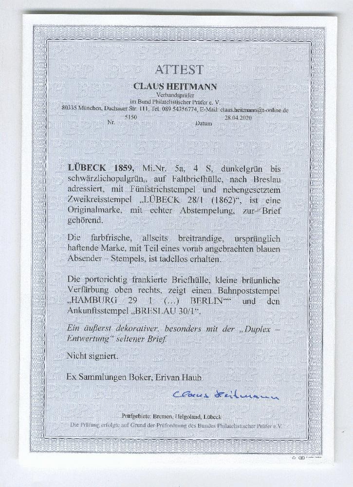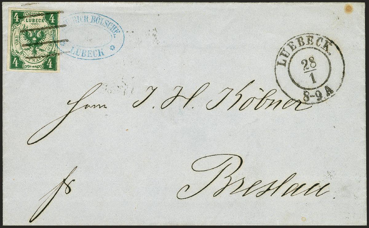 | Zusatzinformationen und Suchstichworte: | 374. Auktion Heinrich Köhler Auktionstermin 27.06.2020 Los 109 4 Schilling dunkelgrün in sehr schöner tiefer Farbe und allseits breitrandig mit ungewöhnlicher 'Doppelentwertung' durch blauen Absenderstempel und klar aufgesetztem Strichstempel auf Briefhülle mit sauber nebengesetztem Doppelkreisstempel "LUEBECK 28/1" (1862) nach Breslau mit Transit- und Ankunftsstempeln. Eine besonders attraktive Einzelfrankatur in tadelloser Erhaltung. Fotoattest Heitmann BPP (2020) (Mi.-Nr. 5a) Ausruf 1.000,00 EUR Zuschlag 1.600,00 EUR (aus der Sammlung Erivan Haub) |