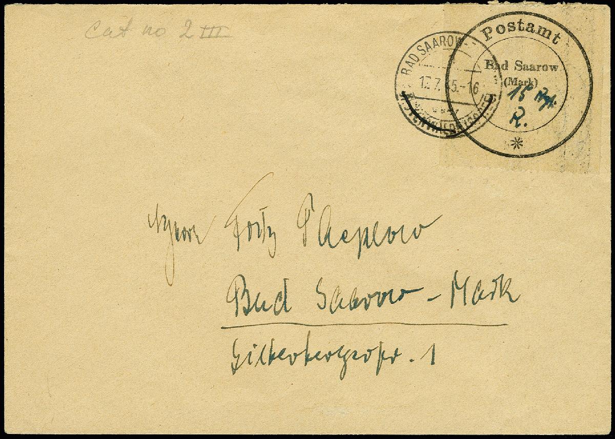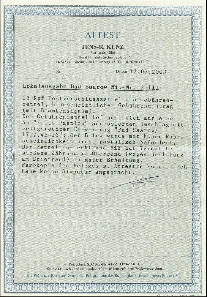 | Zusatzinformationen und Suchstichworte: | 366. Auktion Heinrich Köhler Auktionstermin 19.–24.03.2018 Los 2309 1945, Postverschlußzettel mit handschriftlichem Eintrag "15 Pfennig und Beamtensignatur", sauber mit Stempel "BAD SAAROW 17.7.45", oben minimale Zähnung bestoßen, sonst tadellos, Fotoattest Kunz BPP (2003) Ausruf 150,00 EUR |