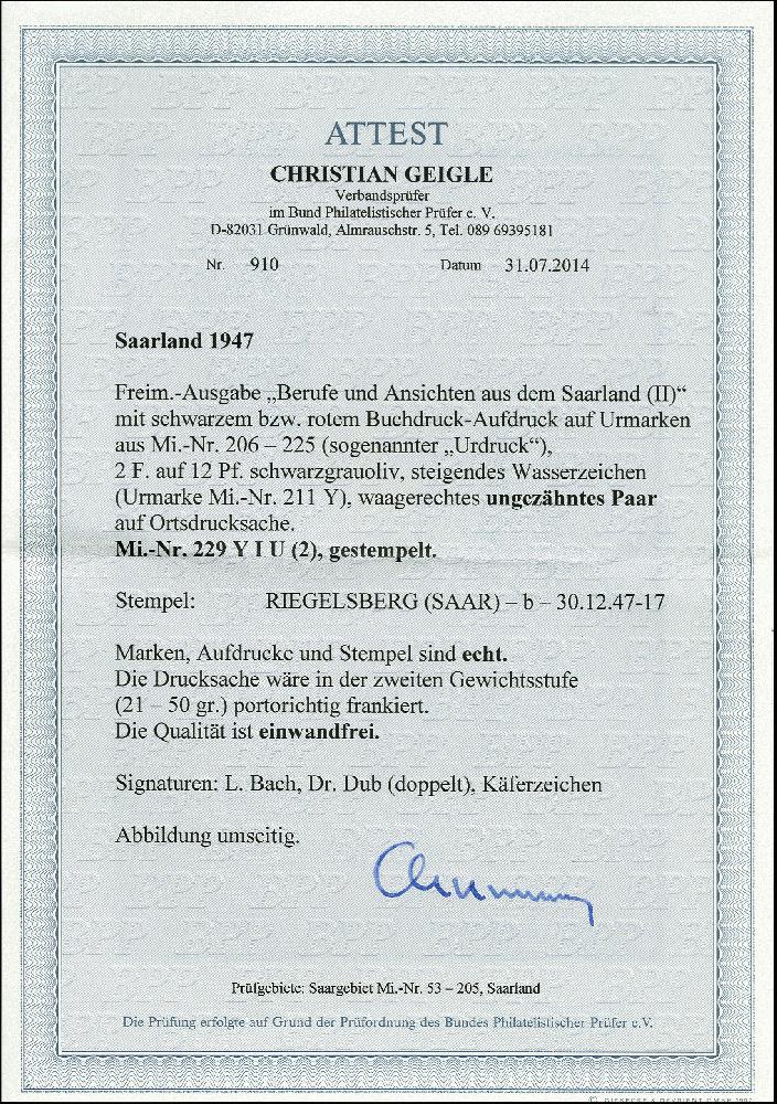 | Prüfgebiet: | Saarland (ab Mi-Nr. 206) |