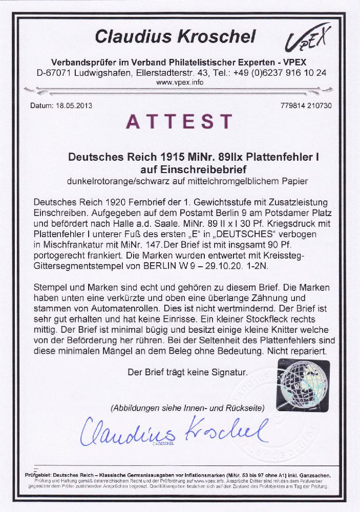 | Prüfer: | Kroschel, Claudius (VPEX (Verband Philatelistischer Experten)) |