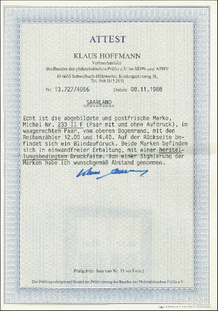 | Prüfgebiet: | Saarland (ab Mi-Nr. 206) |