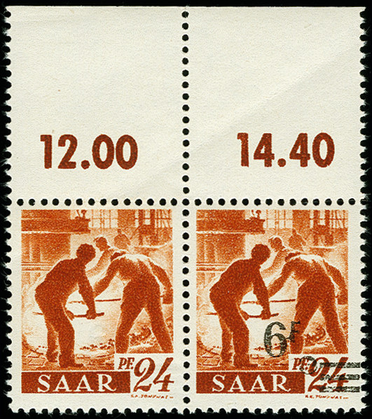 | Zusatzinformationen und Suchstichworte: | 366. Auktion Heinrich Köhler Auktionstermin 19.–24.03.2018 Los 1980 6 Franc auf 24 Pfennig im waagerechten Oberrandpaar, die linke Marke ohne Aufdruck, postfrisch, herstellungsbedingter Gummibug, tadellos, Fotoattest Hoffmann BPP (1988) Ausruf 120,00 EUR |
