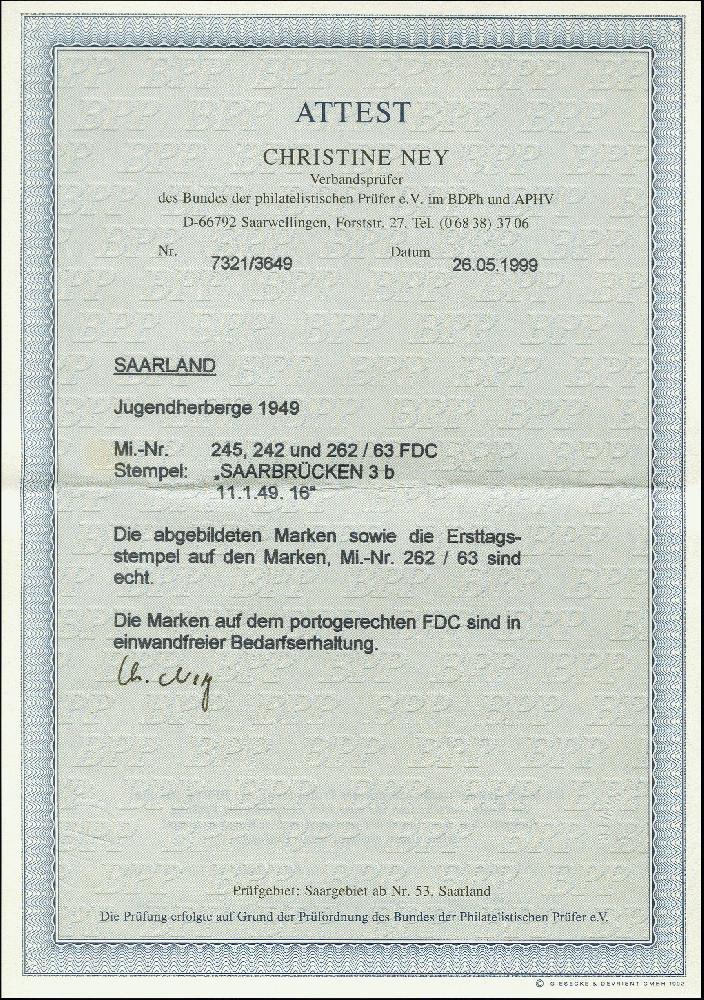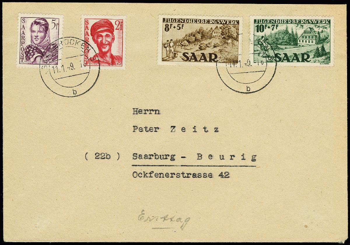 | Zusatzinformationen und Suchstichworte: | 366. Auktion Heinrich Köhler Auktionstermin 19.–24.03.2018 Los 1989 1949, Jugendherbersgwerk 8-10 Fr. mit portogerechter Zufrankatur auf FDC von "SAARBRÜCKEN 11.1.49" nach Saarburg, tadellos, Fotoattest Ney BPP (1999) Ausruf 250,00 EUR |