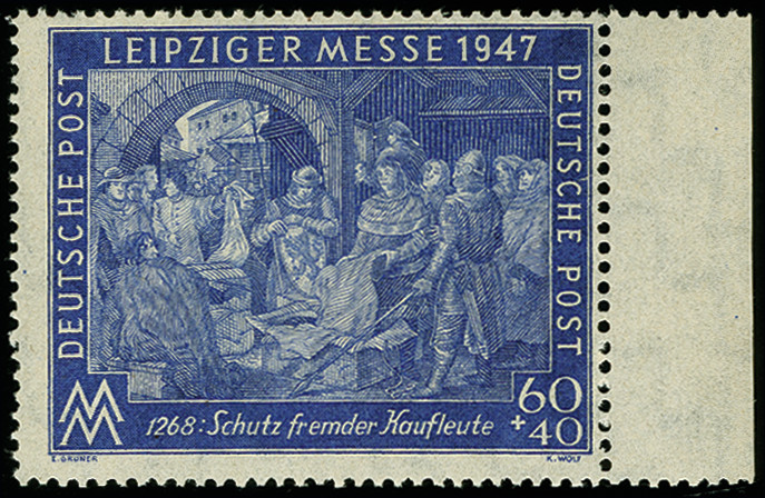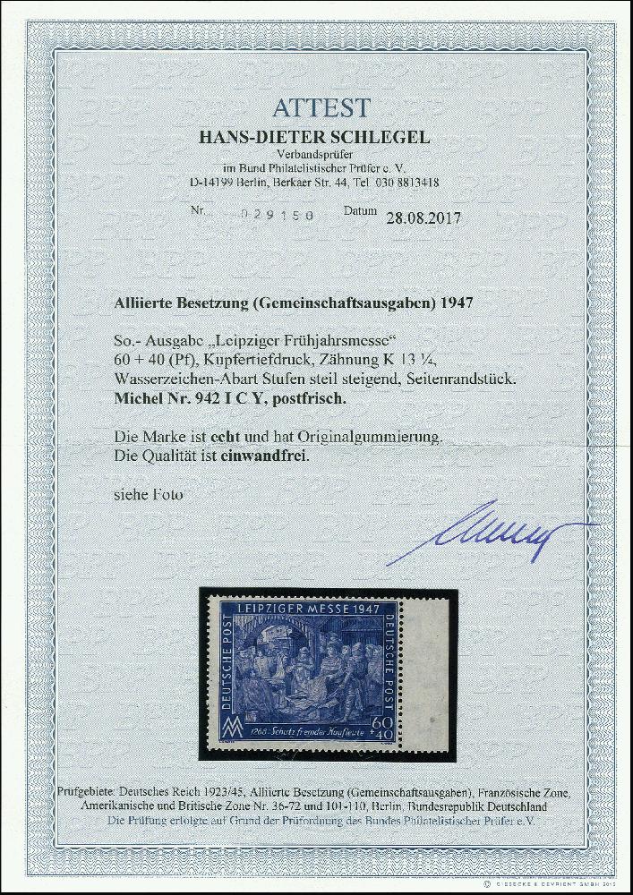 | Zusatzinformationen und Suchstichworte: | 366. Auktion Heinrich Köhler Auktionstermin 19.–24.03.2018 Los 2322 1947, Leipziger Frühjahrsmesse 60 Pfg. mit Zähnung C und Wasserzeichen-Abart "Stufen steil steigend", Randstück, postfrisch, tadellos, Fotoattest D. Schlegel BPP (2017) Zuschlag 160,00 EUR |