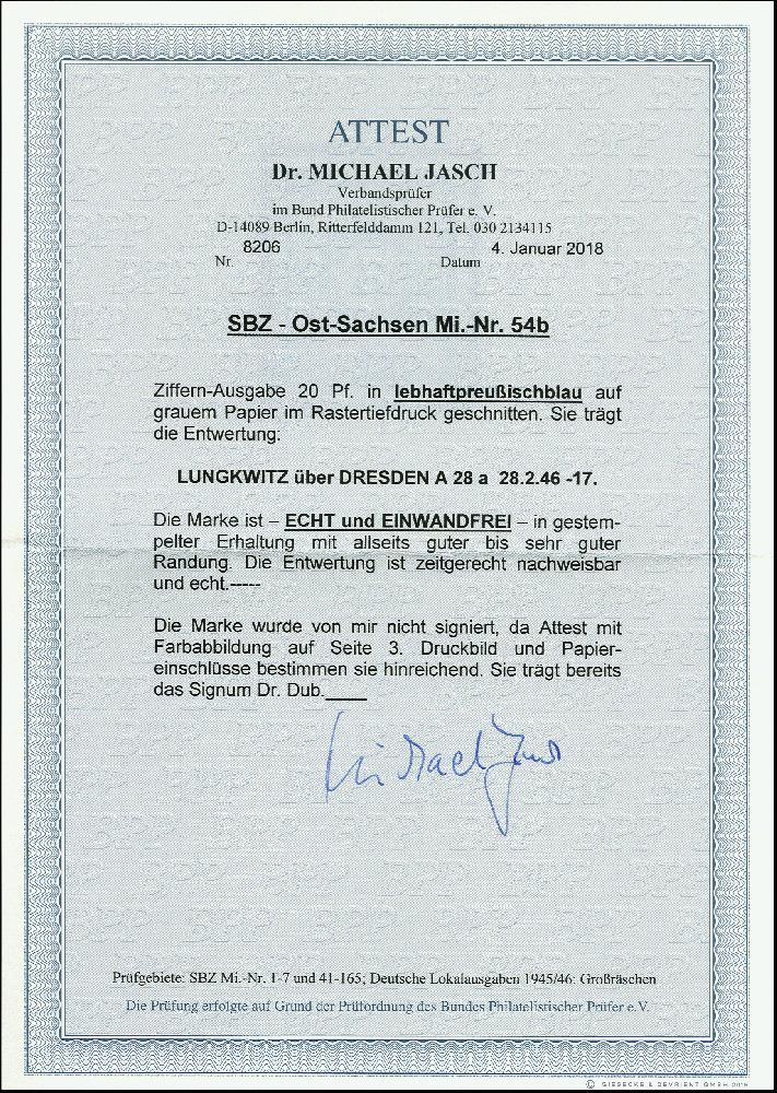 | Zusatzinformationen und Suchstichworte: | 366. Auktion Heinrich Köhler Auktionstermin 19.–24.03.2018 Los 2336 Ziffer 20 Pfg. lebhaftpreußischblau, allseits voll- bis breitrandig, gestempelt "LUNGKWITZ über DRESDEN 28.2.46", tadellos, sign. Dr. Dub, Fotoattest Jasch BPP (2018) (Mi. 6.000,-) Zuschlag 1.250,00 EUR |