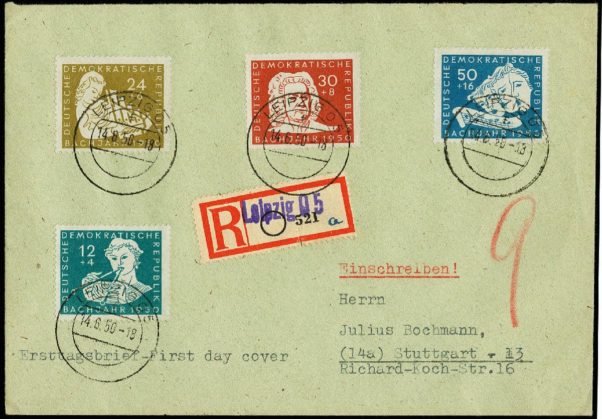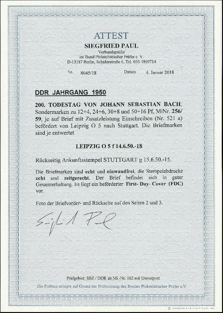 | Zusatzinformationen und Suchstichworte: | 366. Auktion Heinrich Köhler Auktionstermin 19.–24.03.2018 Los 2364 1950, Bach 12-50 Pfg. mit Ersttagsstempel "LEIPZIG 14.6.50" auf R-Brief nach Stuttgart mit Ankunftsstempel, tadellos, Fotoattest Paul BPP (2018) (Mi. 1.400,-) Zuschlag 300,00 EUR |