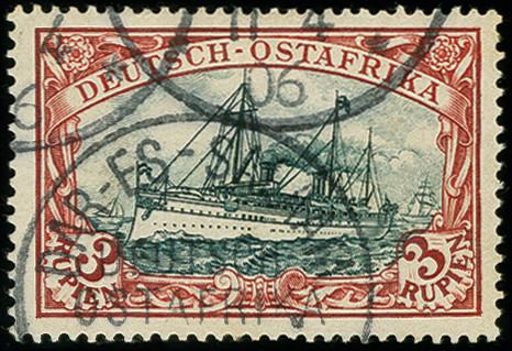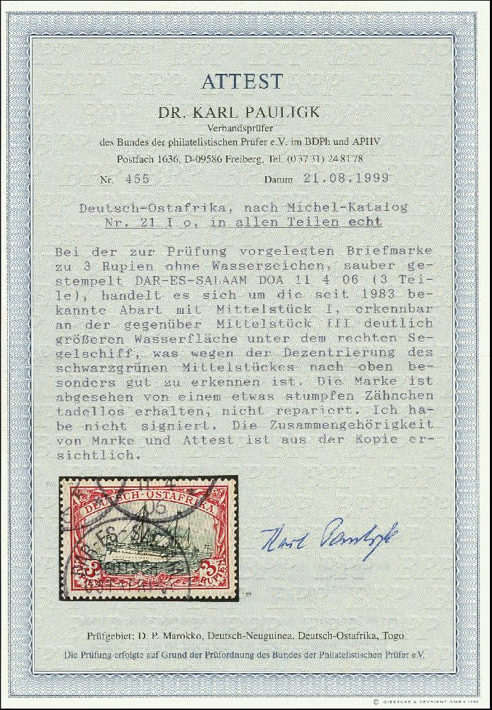 | Zusatzinformationen und Suchstichworte: | 366. Auktion Heinrich Köhler Auktionstermin 19.–24.03.2018 Los 1830 1901, Schiffszeichnung 3 Rupien mit Rahmenzeichnung Type 3 und Mittelstück in Type 1, sauber gestempelt, einige minimal stumpfe Zähnchen, sonst tadellos, Fotoattest Pauligk BPP (1999) Ausruf 250,00 EUR |