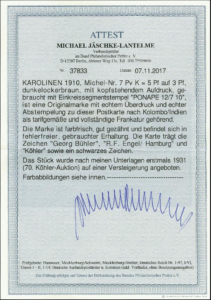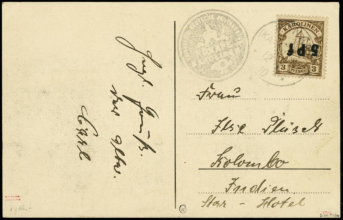 | Zusatzinformationen und Suchstichworte: | 366. Auktion Heinrich Köhler Auktionstermin 19.–24.03.2018 Los 1847 1900, 2. Ponape-Provisorium 5 Pf. auf 3 Pfg. mit kopfstehendem Aufdruck auf Ansichtskarte von "PONAPE 12.7.10" mit nebengesetztem Dienstsiegel nach Kolombo, Indien, Kabinett, u.a. sign. Köhler sowie Fotoattest Jäschke-L. BPP (2017) Provenienz: 70. Heinrich Köhler Auktion (1931) Ausruf 1.500,00 EUR |