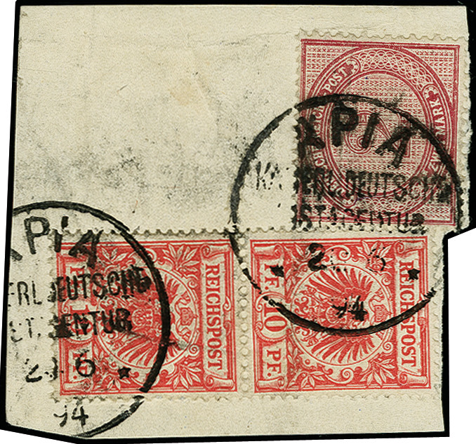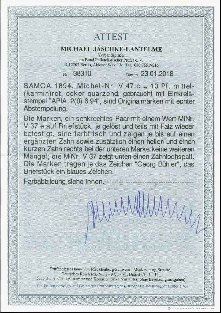 | Zusatzinformationen und Suchstichworte: | 366. Auktion Heinrich Köhler Auktionstermin 19.–24.03.2018 Los 1877 10 Pfg. mittel(karmin)rot (ocker quarzend) im senkrechten Paar und 2 M. dunkelrotkarmin mit zwei übergehenden Stempeln "APIA 20.6.93" auf Briefstück, Marken mit Falz replaziert, senkrechtes Paar farbfrisch mit zwei ergänzten Zähnen und winzige Zahnfehler unten, sonst in guter Gesamterhaltung, Paare dieser schwierigen Farbe sind bei Samoa äußerst selten, sign. Bühler und Fotoattest Jäschke-L. BPP (Mi. 5.350,-) Ausruf 700,00 EUR |