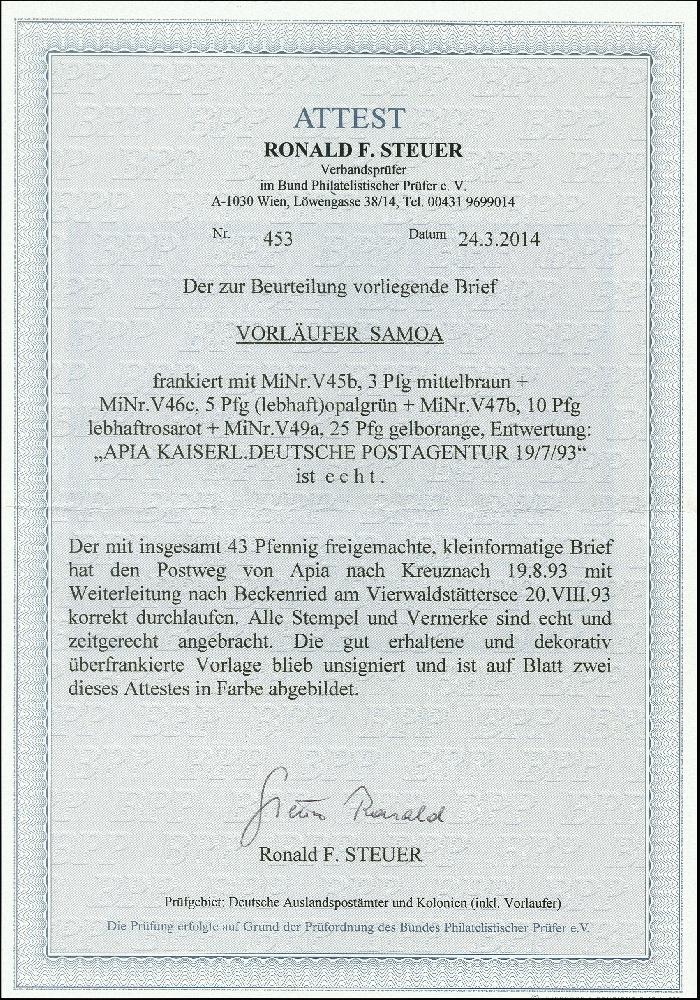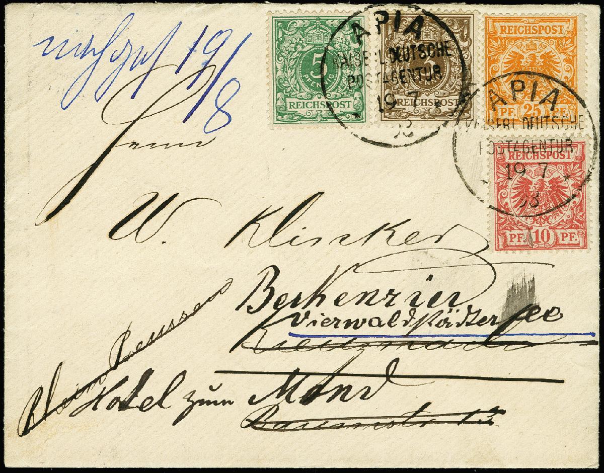 | Zusatzinformationen und Suchstichworte: | 366. Auktion Heinrich Köhler Auktionstermin 19.-24.03.2018 Los 1879 25 Pfg. gelborange, 10 Pfg. lebhaftrosarot, 5 Pfg. opalgrün und 3 Pfg. mittelbraun auf etwas überfrankiertem Brief der 2. Gewichtsstufe von "APIA KDPAg 19.7.92" nach Kreuznach mit Nachsendung, dekorative Buntfrankatur in guter Erhaltung, Fotoattest R.Steuer BPP Zuschlag 750,00 EUR |