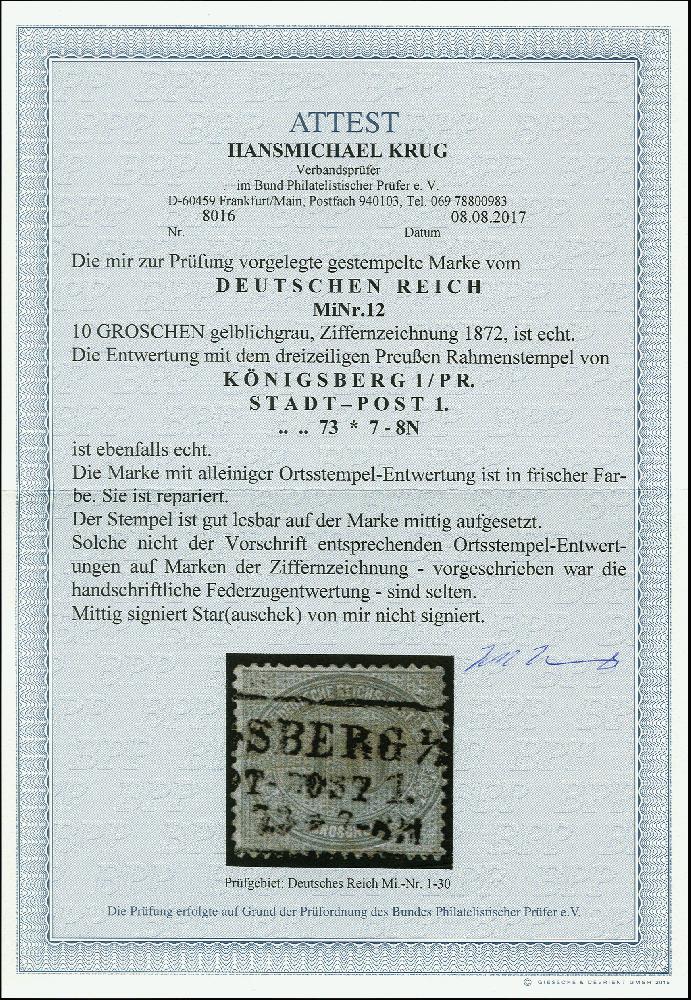 | Zusatzinformationen und Suchstichworte: | 366. Auktion Heinrich Köhler Auktionstermin 19.-24.03.2018 Los 1434 10 Gr. gelblichgrau mit Ra3 "KÖNIGSBERG I/PR. STADT-POST 1...73" als alleinige Entwertung, repariert, optisch feines Stück, sign. "Star(auschek)" und Fotoattest Krug BPP (2017) (Mi. 1.800,-) Ausruf 200,00 EUR |