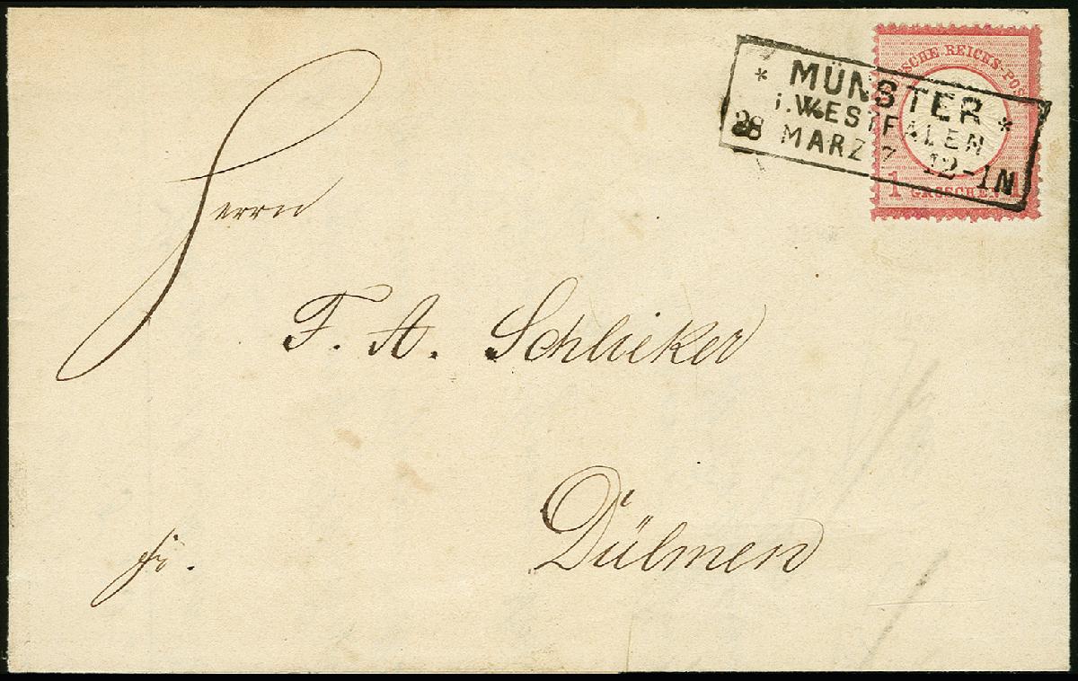 | Zusatzinformationen und Suchstichworte: | 366. Auktion Heinrich Köhler Auktionstermin 19.-24.03.2018 Los 1442 1 Gr. karmin mit Plattenfehler "Gebrochenes N in GROSCHEN" und Prägefehler "senkrecht ausgefallene Prägung links im Prägefeld" (Feld 143) als portogerechte Einzelfrankatur auf kpl. Faltbrief von "MÜNSTER i. WESTFALEN 28.MARZ.73" nach Dülmen, Marke mit wenigen kurzen Zähnen und replaziert, sonst in guter Gesamterhaltung, sehr seltene Kombination, Fotoattest Brugger BPP (2003) Ausruf 250,00 EUR |