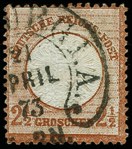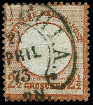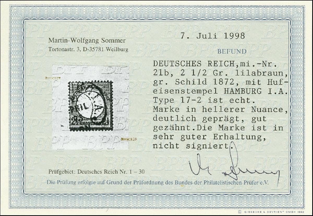 | Zusatzinformationen und Suchstichworte: | 366. Auktion Heinrich Köhler Auktionstermin 19.-24.03.2018 Los 1443 2 1/2 Gr. lilabraun mit Hufeisenstempel "HAMBURG I.A. 21.APRIL.73" (Spalink 17-2), farbfrisch und gut gezähnt, tadellos, Fotobefund Sommer BPP (1998) (Mi. 800,-) Ausruf 150,00 EUR |