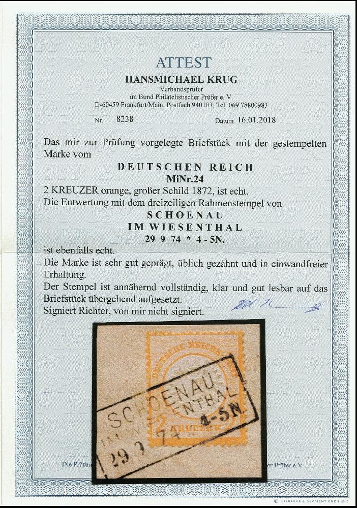 | Zusatzinformationen und Suchstichworte: | 366. Auktion Heinrich Köhler Auktionstermin 19.-24.03.2018 Los 1447 2 Kr. orange, sehr gut geprägt und üblich gezähnt mit klarem Ra3 "SCHOENAU IM WIESENTHAL 29.9.74" auf Briefstück, leichte Patina, ansonsten tadellos, sign. Richter und Fotoatteste Hennies BPP (1984) und Krug BPP (2018) (Mi. 3.200,-) Zuschlag 550,00 EUR |