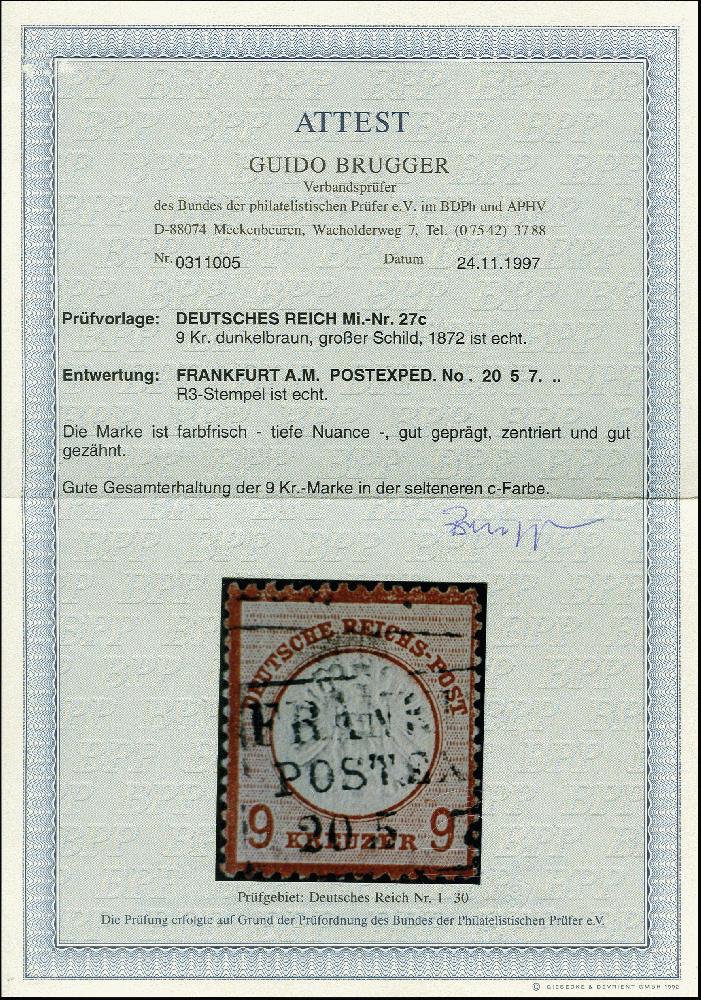 | Zusatzinformationen und Suchstichworte: | 366. Auktion Heinrich Köhler Auktionstermin 19.-24.03.2018 Los 1452 9 Kr. dunkelbraun, farbfrisch, gut geprägt, zentriert und gut geprägt, gestempelt, tadellos, Fotoattest Brugger BPP (1997) (Mi. 1.700,-) Zuschlag 350,00 EUR |