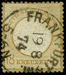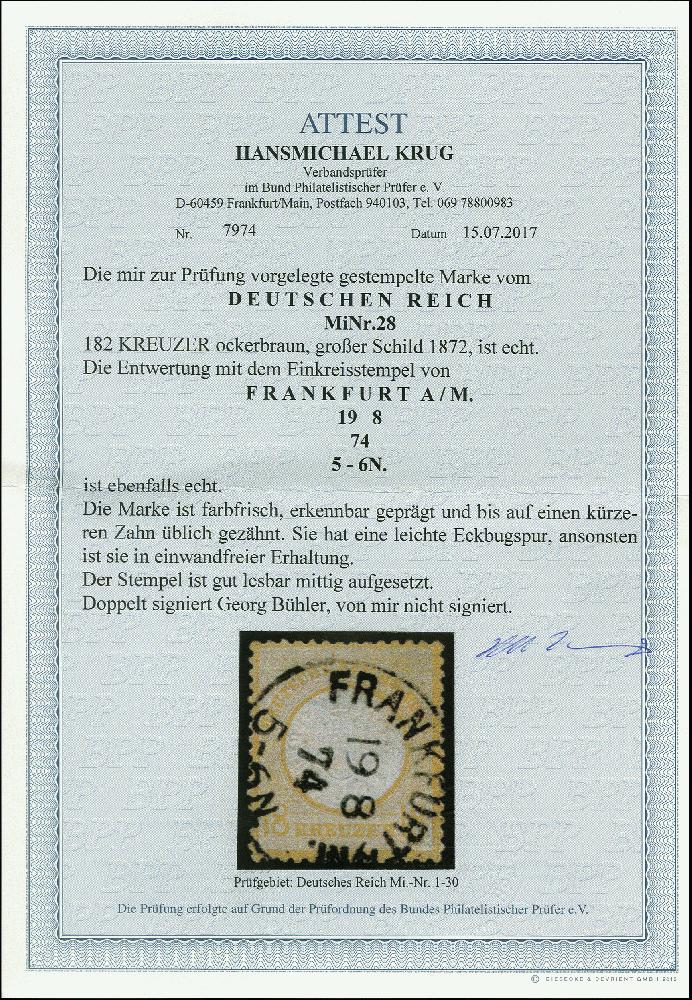| Zusatzinformationen und Suchstichworte: | 366. Auktion Heinrich Köhler Auktionstermin 19.-24.03.2018 Los 1454 18 Kreuzer ockerbraun, farbfrisch und erkennbar geprägt, bis auf einen kürzeren Zahn üblich gezähnt, sauber gestempelt "FRANKFURT 19 8 74 5-6N.", leichte Eckbugspur sonst in tadelloser Erhaltung, eine schöne Marke mit gut lesbar mittig aufgesetztem Stempel, signiert Bühler und Fotoattest Krug BPP (2017) Ausruf 400,00 EUR |