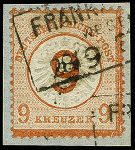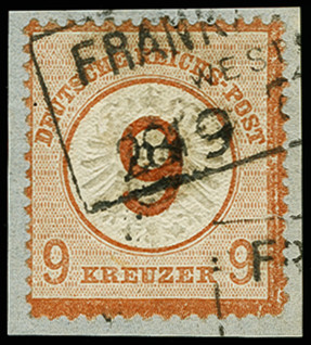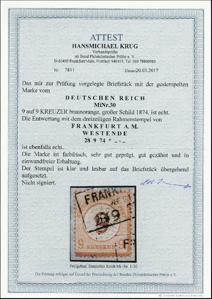 | Zusatzinformationen und Suchstichworte: | 366. Auktion Heinrich Köhler Auktionstermin 19.-24.03.2018 Los 1455 9 auf 9 Kr. braunorange mit Stempel "FRANKFURT A.M. WESTENDE 28.9.74..." auf Briefstück, tadellos, Fotoattest Krug BPP (2017) (Mi. 600,-) Zuschlag 120,00 EUR |