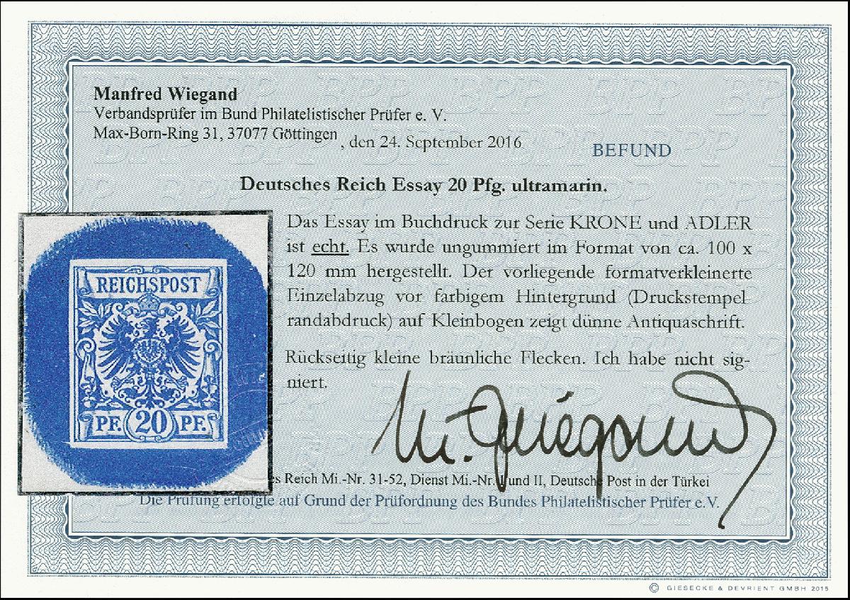 | Zusatzinformationen und Suchstichworte: | 366. Auktion Heinrich Köhler Auktionstermin 19.-24.03.2018 Los 1473 20 Pfg. ultramarin als Essay im Buchdruck, formatverkleinerter Einzelabzug vor farbigem Hinterdruck, ungebraucht ohne Gummi, rückseitig mit kleinen bräunlichen Flecken, sonst tadellos, Fotobefund Wiegand BPP (2016) Zuschlag 72,00 EUR |