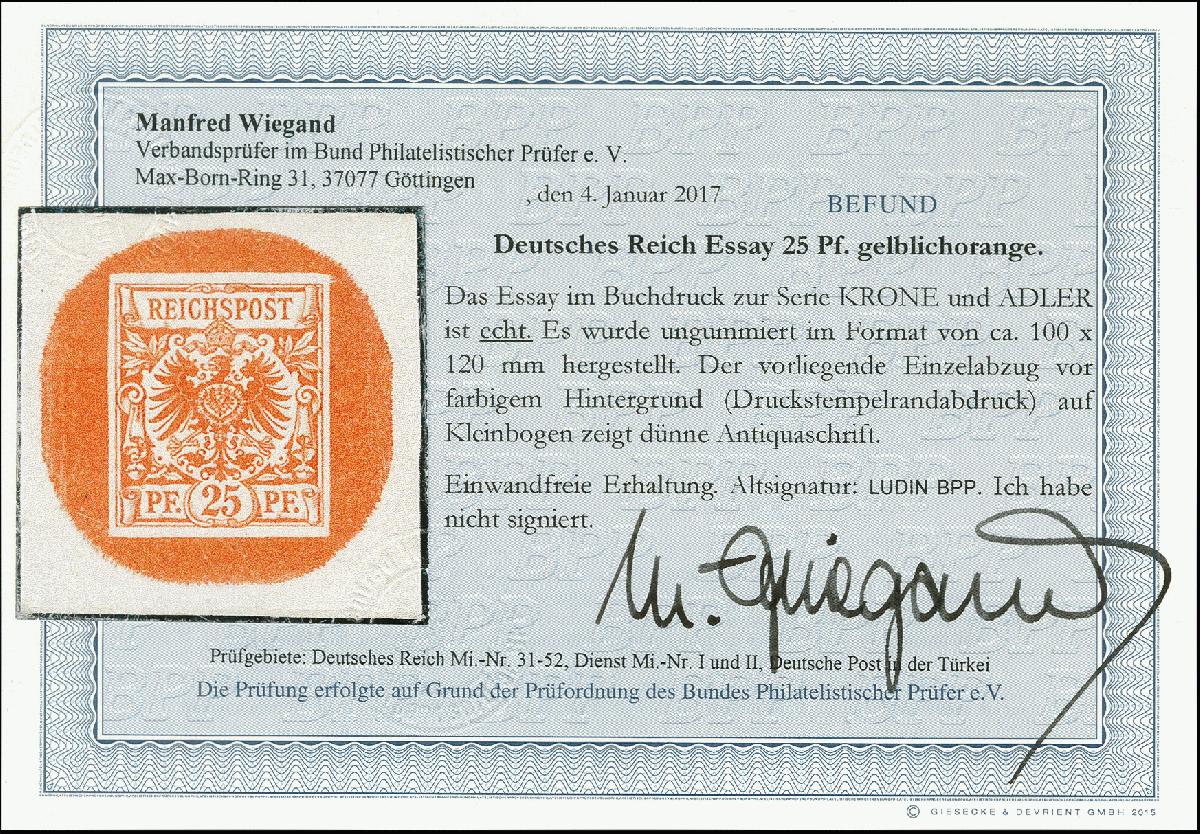 | Zusatzinformationen und Suchstichworte: | 366. Auktion Heinrich Köhler Auktionstermin 19.-24.03.2018 Los 1474 25 Pfg. gelblichorange als Essay im Buchdruck, formatverkleinerter Einzelabzug vor farbigem Hinterdruck, ungebraucht ohne Gummi, tadellos, sign. Ludin BPP und Fotobefund Wiegand BPP (2017) Zuschlag 90,00 EUR |