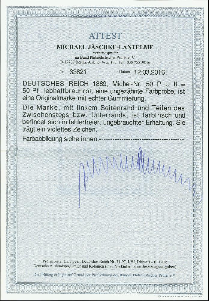 | Zusatzinformationen und Suchstichworte: | 366. Auktion Heinrich Köhler Auktionstermin 19.-24.03.2018 Los 1475 50 Pfg. lebhaftbraunrot, ungezähnte Farbprobe aus der linken unteren Bogenecke bzw. mit Teilen des Zwischenstegs unten, ungebraucht, tadellos, Fotoattest Jäschke-L. BPP (2016) (Mi. 600,-) Zuschlag 135,00 EUR |