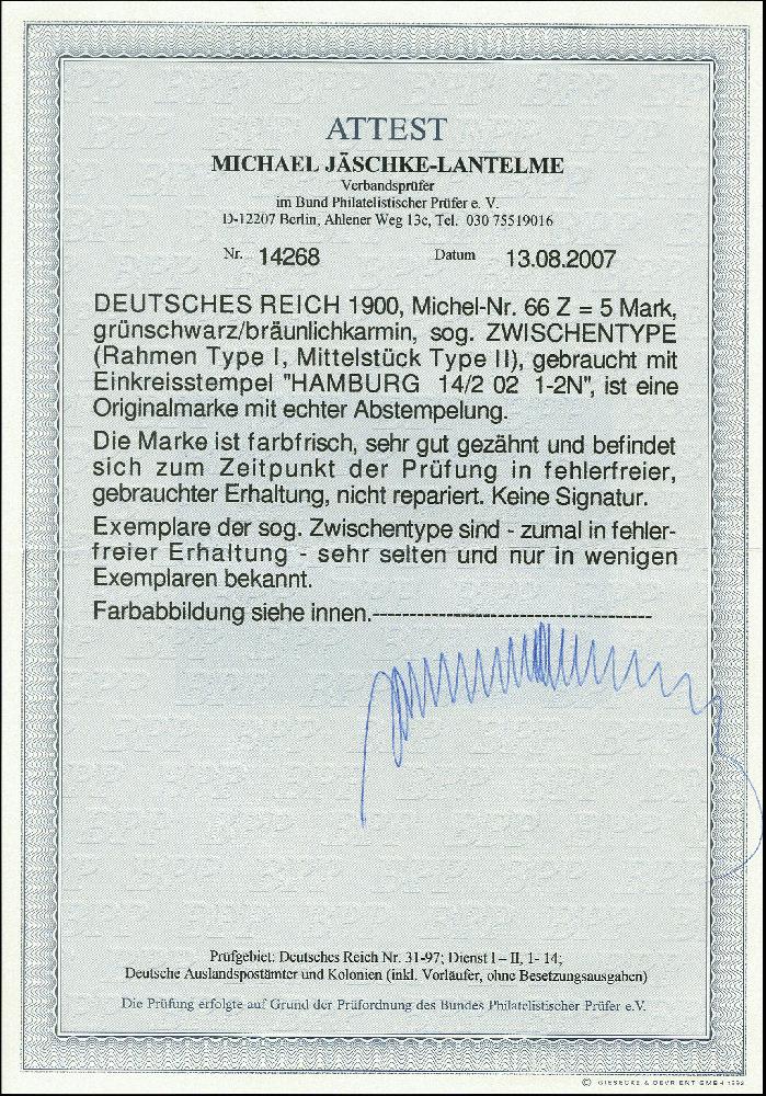 | Prüfgebiet: | Deutsches Reich 1871 - 1918 (Mi-Nr. 1 - 106) |