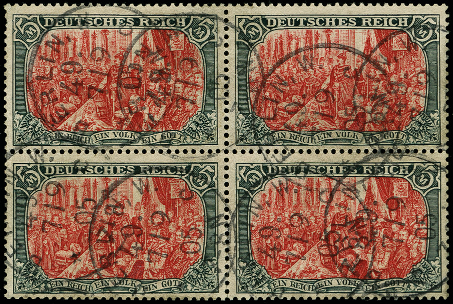 | Zusatzinformationen und Suchstichworte: | 366. Auktion Heinrich Köhler Auktionstermin 19.-24.03.2018 Los 1500 5 M. grünschwarz/dunkelkarmin (gelblichrot quarzend) im Viererblock, sauber gestempelt, die beiden linken Marken mit kurzem Zahn bzw. kleinem Einriss und Einheit unten leicht angetrennt, ansonsten in tadelloser Erhaltung; sehr seltene Einheit, doppelt sign. Zenker VÖB und Fotoattest Jäschke-L. BPP (2003) Zuschlag 400,00 EUR |